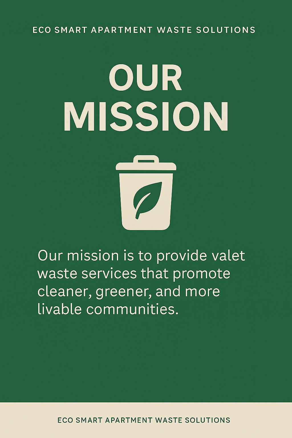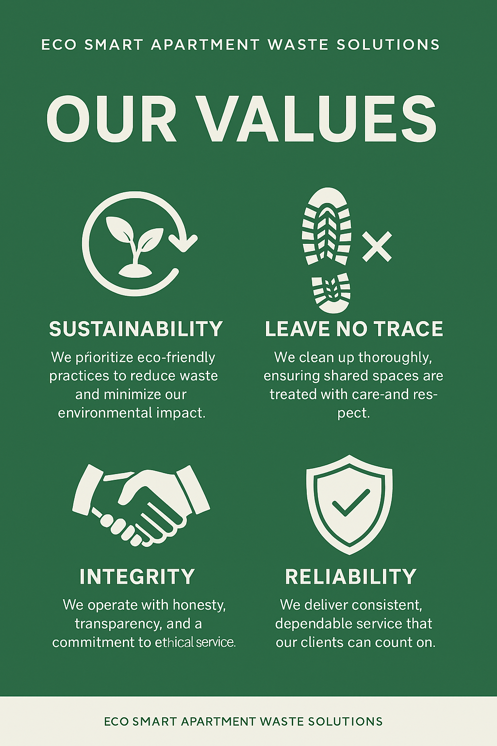 Eco Smart Apartment Waste Solutions exists to elevate the standard of community living by delivering efficient, reliable, and environmentally responsible waste services. We empower apartment communities to stay clean, compliant, and sustainable by integrating the core principles of Leave No Trace into every aspect of our operations.